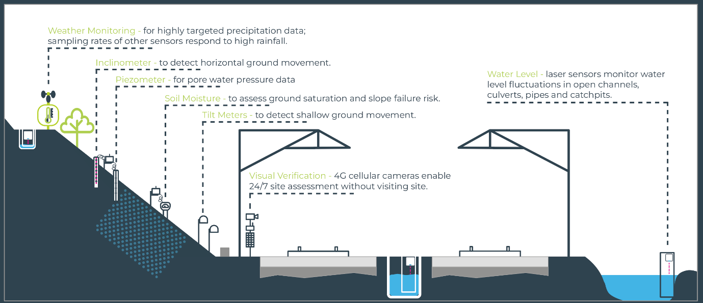 Such a drainage monitoring system may include radar- or laser- based water level sensors, weather stations, soil moisture probes and piezometers (for groundwater characterisation), and automated cameras. Solutions can be tailored for the specific needs of a site and easily adapted as those needs evolve. As an example, soil moisture can be monitored at the surface with a simple shallow probe, or at multiple depths to a metre or more using a multi-sensor probe. For analysis of deeper groundwater conditions multiple piezometers can be installed in a borehole.